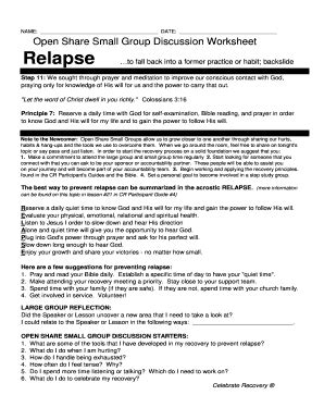 An Open Share Small Group Discussion Worksheet is a set of questions that participants in Celebrate Recovery can use to facilitate an open discussion. The worksheet allows members to share their stories, experiences, and struggles with addiction and other issues in a safe and supportive environment. The worksheet also helps to identify areas of growth and healing that need to be addressed in order to reach a point of recovery.